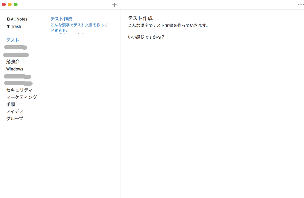 simplenoteは3ペイン型のノートで、左ペインにTAG名、中ペインに選択したTAGに属するメモ一覧、右ペインにメモ本文の編集画面がレイアウトされている。メモの1行目がタイトルとなるのはATOK Padと同じ仕様。更に各メモに複数のTAGを設定しグループ化する事ができるのも特徴だ。TAGの設定は思いのまま。後から追加や削除、変更も出来る。